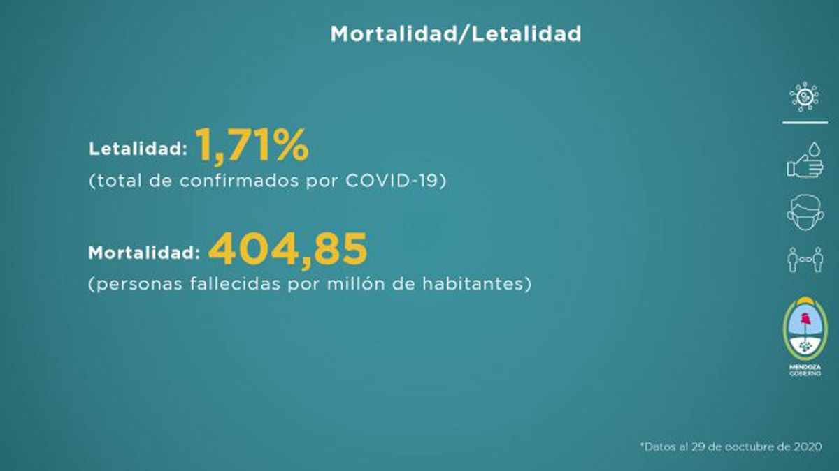 Al observar el porcentaje de fallecidos según el grupo etario, Mendoza cuenta con una Mortalidad de 343,1 por millón de habitantes y de Letalidad 1,65% por total de confirmados por coronavirus.