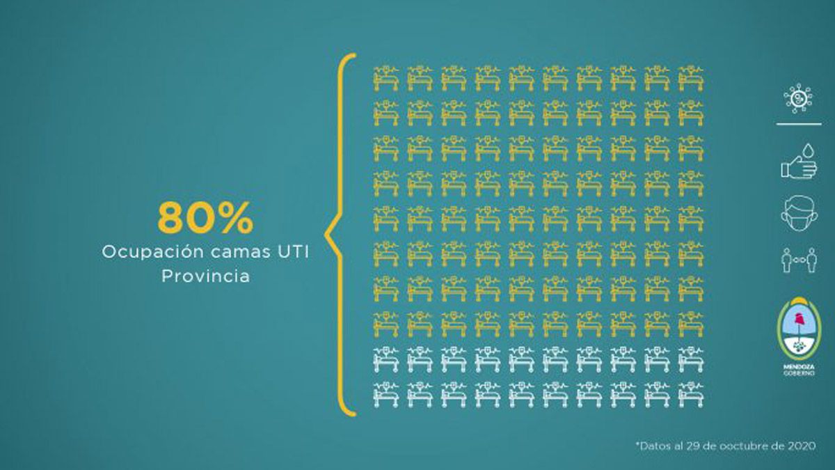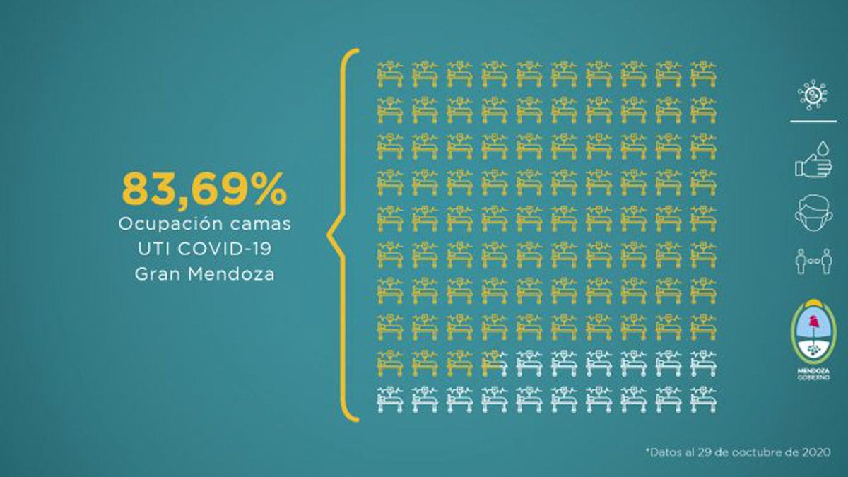 El Ministerio de Salud de Mendoza dio a conocer su parte semanal sobre la situación sanitaria de la provincia. Allí se indicó que la ocupación de camas de terapia intensiva es del 80% en todo el territorio y de 83,69% en el Gran Mendoza. En tanto, esta semana con más de 5.000 contagios se rompió la barrera de los 20 mil casos durante octubre y se triplicó el número de muertes con respecto a septiembre.