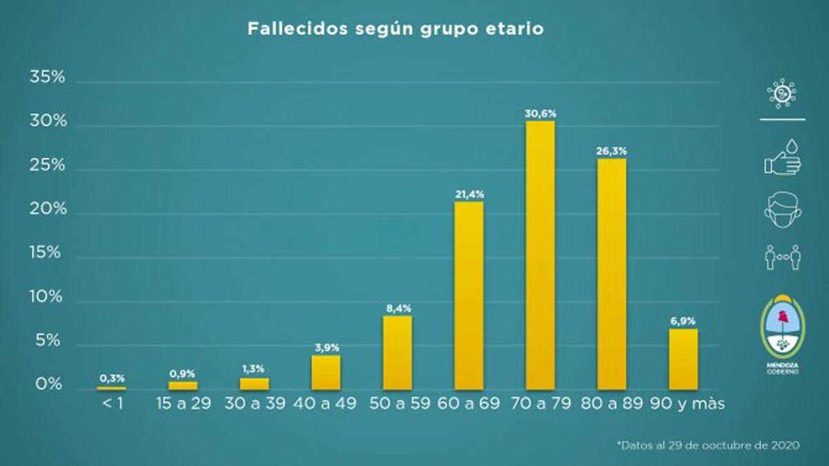 Asimismo, el grupo etario más vulnerable frente a la enfermedad sigue siendo el de los adultos mayores. El 77,5% de los fallecidos tiene entre 60 años a los 89 años y las personas de más de 90 años representa el 7%.