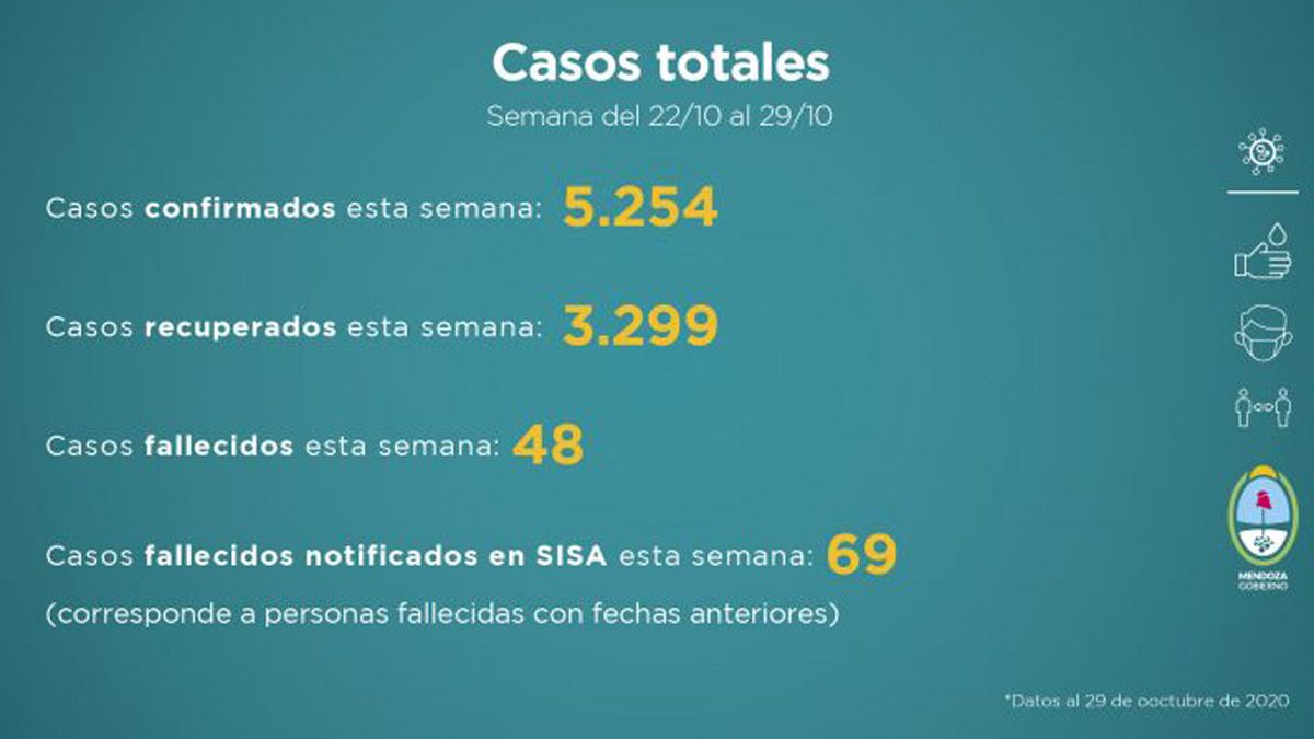 La cantidad de casos de coronavirus en la semana del 15 al 22 de octubre de 2020: 5.570 confirmados, 3.391 recuperados, 48 fallecidos y 153 casos fallecidos notificados en SISA esta semana (corresponde a personas fallecidas con fechas anteriores).
