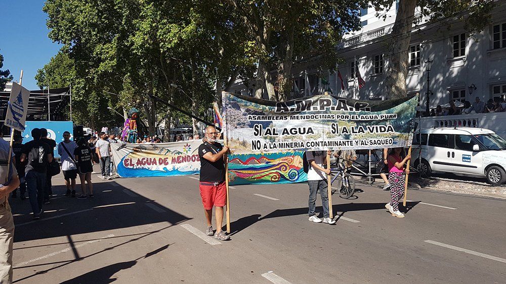 Las Asambleas Mendocinas por el Agua Pura encabezaron las contramarchas y protestas en el Carrusel Vendimial bastante politizado por la cantidad de reclamos, entre ellos los de docentes o los de la familia de Darío Chacón.