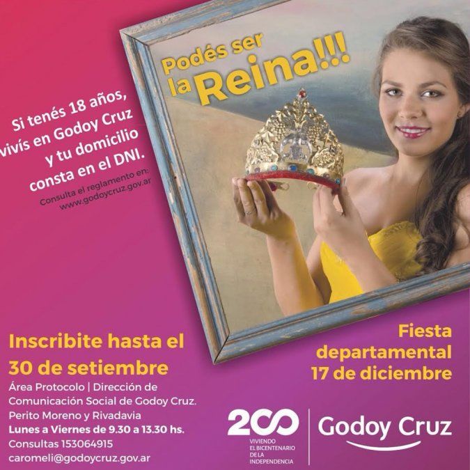 La Municipalidad de Godoy Cruz informó que se encuentra abierta la inscripción a aspirantes al cetro vendimial de jóvenes desde los 18 años cumplidos y secundario completo.