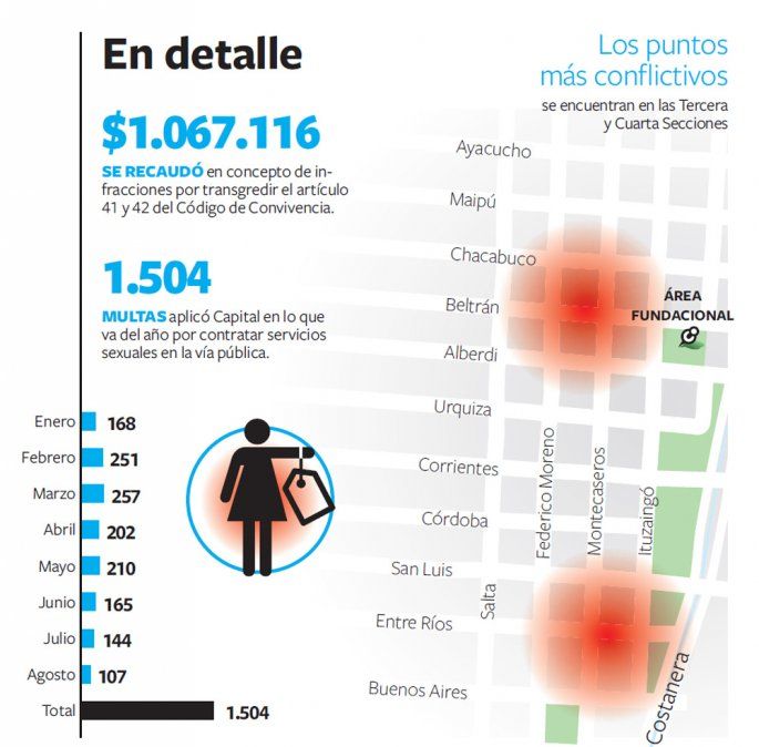 Las zonas de mayor oferta de servicios sexuales en la vía pública siguen siendo la Tercera y Cuarta Secciones. Las calles donde se detectaron infracciones son Federico Moreno, Beltrán, Salta, Ayacucho, Chacabuco, Maipú, Ituzaingó, Buenos Aires, Montecaseros, Córdoba y Corrientes. Esos puntos de consumo, a partir de la presencia municipal, se están trasladando a otros sectores.