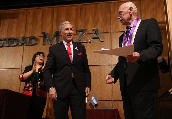 El reconocido historiador Miguel Ángel De Marco recibió ayer el Doctorado Honoris Causa en la Universidad Maza. Durante la ocasión, el especialista en historia política, militar y naval brindó una conferencia magistral titulada "Sarmiento y Mendoza".El rector de la casa de altos estudios, Daniel Miranda, fue quien le entregó la distinción al ilustre visitante, reconocido internacionalmente por su trayectoria. La actividad se realiza en el marco del Bicentenario de la Independencia Argentina, celebrado este año.Miguel Ángel De Marco es doctor en Historia graduado en la Universidad del Salvador y fue presidente de la Academia Nacional de la Historia de la República Argentina. Además es miembro de número de la Academia Sanmartiniana del Instituto Nacional Sanmartiniano y correspondiente de la Real Academia de la Historia de España, de la Academia Portuguesa da Historia y de casi todos los institutos y academias nacionales de Iberoamérica.Escribió más de 40 libros, dedicados a evocar aspectos del pasado. Además de ser escritor y poeta ha sido colaborador permanente en diarios y revistas nacionales y del exterior (La Nación, Clarín, La Capital de Rosario y La Gaceta de Tucumán).Posee numerosas condecoraciones civiles y militares argentinas y del extranjero, como caballero oficial de la Orden al Mérito de la República Italiana, cruz del Mérito Naval de primera clase de España, comendador del Mérito Civil del Reino de España, Cruz Naval a los Servicios Distinguidos de la Armada Argentina y comendador de la Orden de los Servicios Distinguidos del Ejército Argentino.
