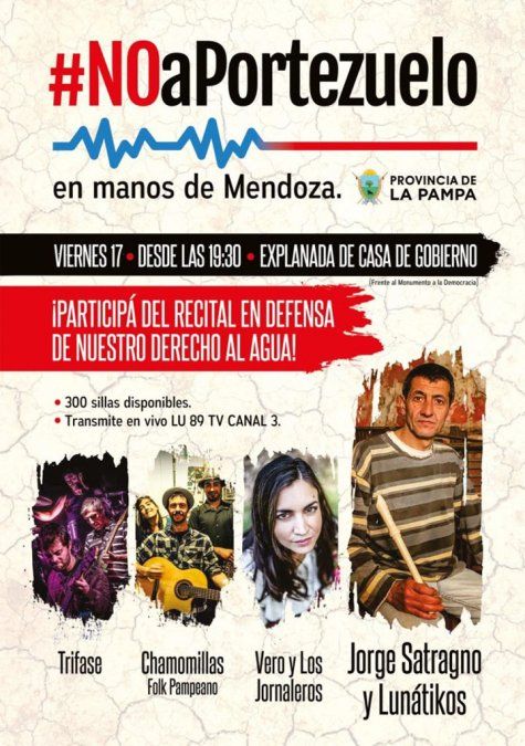 El gobierno de La Pampa ha organizado un festival con artistas de esa provincia bajo el lema "No a Portezuelo en manos de Mendoza".El espectáculo tendrá lugar en la explanada de de la Casa de Gobierno este viernes por la tarde y sonarán bandas tales como: "Vero y los Jornaleros", "Chamomillas", Trifase y "Jorge Satragno y Lunátikos".También se entregarán gorras y remeras con la consigna #NOaPortezuelo en manos de Mendoza.El malestar de la vecina provincia contra el proyecto hidroeléctrico también se desarrolla en el Comité Interjurisdiccional de Río Colorado (COIRCO), donde el gobernador Carlos Verna ha criticado en cuantiosas oportunidades que el manejo del recurso sea de Mendoza.El lunes, durante la Bendición de los Frutos, Alfredo Cornejo acusó a las autoridades pampeanas de retrasar la licitación de las obras con trámites administrativos pese a tener el presupuesto aprobado.