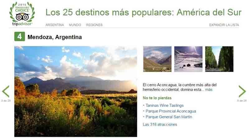 El sitio web TripAdvisor destaca en su sección de los premios Traveller's Choice 2016 a la provincia de Mendoza. El portal hace una división del mundo por regiones y así podemos encontrar a Mendoza en el 4° lugar entre los 25 destinos más populares de América del Sur. Se ubicó debajo de Buenos Aires, Cuzco y Río de Janeiro.
