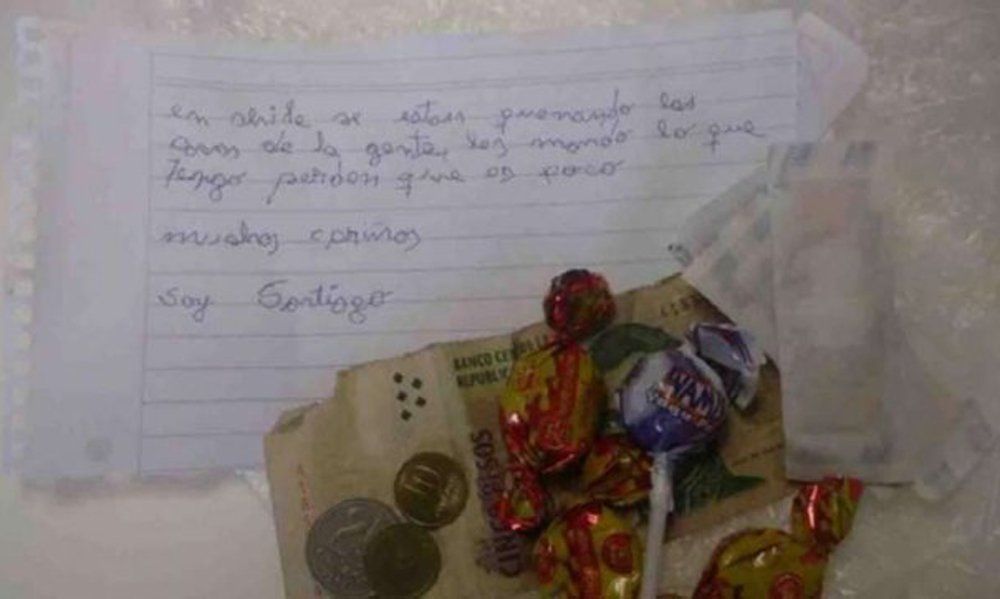 Un nene mendocino emocionó a todos en las redes sociales luego de decidir donar sus ahorros para ayudar a las víctimas de los incendios forestales que mantienen en vilo a la sociedad chilena. Hasta el momento hay casi 400 mil hectáreas afectadas por las llamas que combaten cientos de voluntarios del otro lado de la cordillera.Desde diferentes países se movilizaron para enviar expertos, materiales para combatir el fuego, aeronaves y donaciones. Entre todas las cosas que llegaron a Chile, se destaca la carta de un chico argentino.Santiago, un pequeño de Malargüe, envió un sobre que contenía monedas, dulces y curitas para enfrentar la emergencia. La carta se viralizó inmediatamente en las redes sociales."En Shile (sic) se están quemando las casas de la gente, les mando lo que tengo perdón que es poco. Cariños. Soy Santiago", decía la carta, que llegó junto a algunas monedas y un billete de cinco pesos.La historia fue compartida por la Tercera Compañía de Bomberos de Coquimbo y rápidamente se repartió por las redes. Muchas personas agradecieron la solidaridad del pequeño argentino frente al drama que vive el pueblo chileno.La Conaf informó que había un total de 103 incendios forestales, de los que 53 estaban en fase de combate, 48 bajo control y dos han sido extinguidos. Los peores incendios de la historia de Chile ya dejaron 10 víctimas fatales.Fuente: La Capital