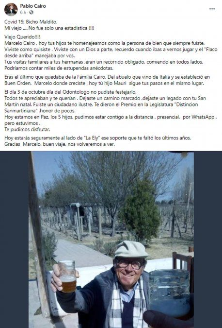 "Todos te apreciaban y te querían. Dejaste un camino marcado, dejaste un legado con tu San Martín natal. Fuiste un ciudadano ilustre. Te dieron el Premio en la Legislatura Distinción Sanmartiniana, honor de pocos", destacó con profunda emoción el legislador quién no pudo despedirse presencialmente de su padre: "Hoy estamos en Paz, los 5 hijos, pudimos estar contigo a la distancia , presencial, por WhatsApp, pero estuvimos".