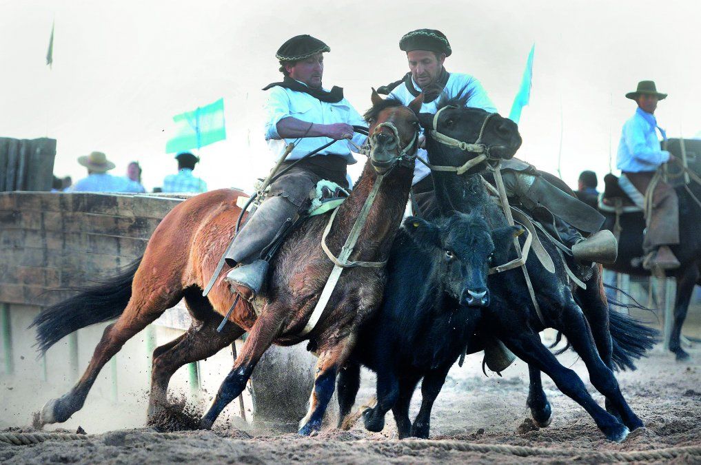 Paleteada. Dos jinetes llevan al novillo desde la salida del brete hasta un punto distante a unos 100 metros.