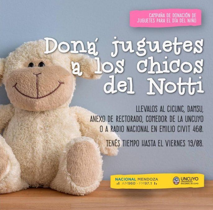 "Doná juguetes a los chicos del Notti" se llama la acción conjunta que realizan la Universidad, Radio Nacional Mendoza y la Cooperadora del Hospital Humberto Notti, en el contexto de una serie de campañas de bien social que se van a organizar entre los medios públicos de Mendoza.