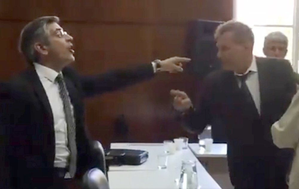 La sola mención de su renuncia a la candidatura llenó de ira al representante de la Cámara de Servicios Mineros. Entre otras cosas, acusó a Romano de presionarlo con su hija -cosa que Romano negó- y finalmente le gritó "sos un infeliz".