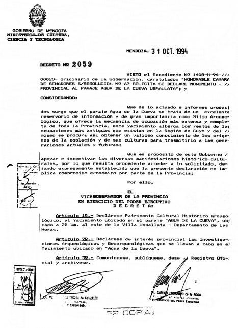 La declaración de Patrimonio tiene el número de decreto 2059, de octubre de 1994, y lleva la firma del entonces vicegobernador Carlos de la Rosa, según el facsímil que envió a este portal el arqueólogo Alejandro García, quien hizo importantes descubrimientos en ese alero rocoso y fue uno de los impulsores de esa declaración.
