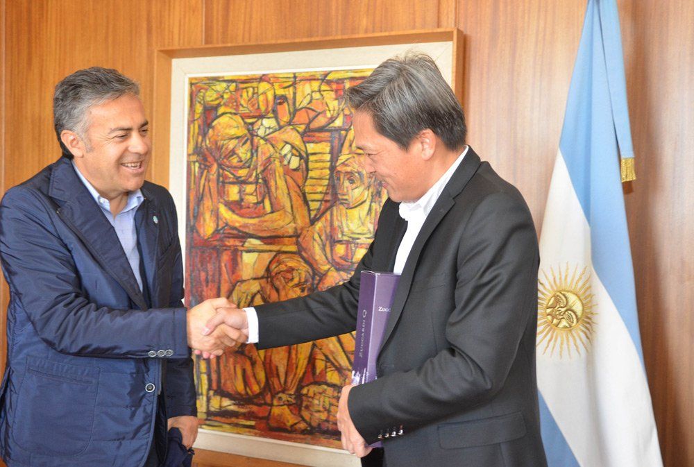El gobernador de Mendoza Alfredo Cornejo recibió en su despacho a Jiafu Yuan, el gerente manager de China Gezhouba Group Company sucursal Argentina, quien "está interesado en financiar obras de infraestructura hidroeléctrica, de energías renovables, viales, de mejoramiento productivo como impermeabilización de canales de riego y relacionadas con el mejoramiento del agua potable y de cloacas", según explicó Martín Kerchner, ministro de Economía y Finanzas.