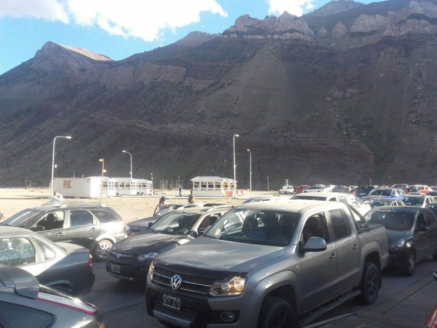 Mientras las casetas externas se encuentran fuera de funcionamiento, la fila de vehículos que intentan ingresar a Mendoza por el complejo Horcones llega hasta la base del cerro Aconcagua. Debido a las importantes demoras, autoridades chilenas decidieron cortar el tránsito para que las colas no continúen hasta la curva de la Soberanía.
