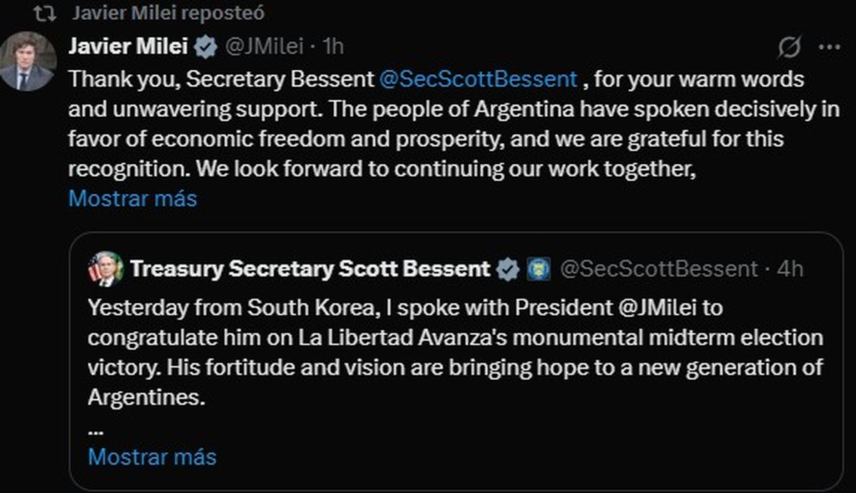El presidente Javier Milei agradeció públicamente al secretario del Tesoro de Estados Unidos, Scott Bessent, por felicitar a La Libertad Avanza (LLA) tras su reciente triunfo en las elecciones legislativas y por su "apoyo incondicional".