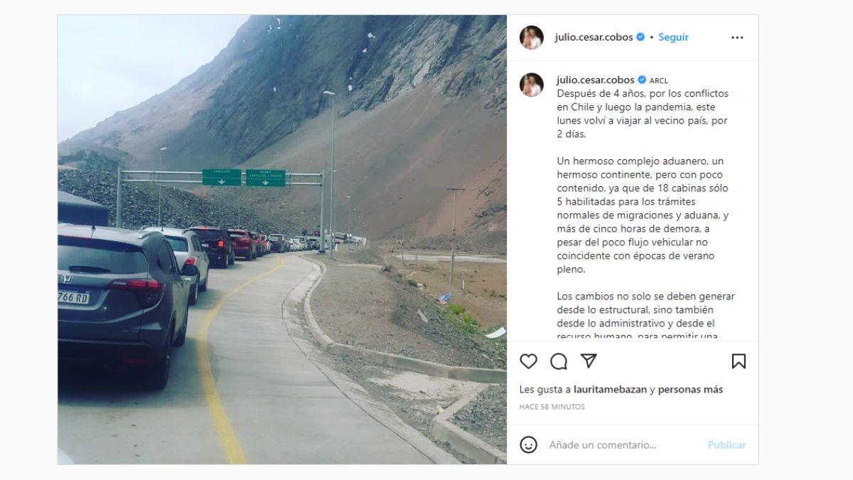 Pasadas las 17.30 de este lunes, el actual diputado nacional por Mendoza Julio Cobos, de Juntos por el Cambio, posteó en su cuenta de Instagram una extensa queja por las demoras en el complejo Los Libertadores, donde detalló las pocas garitas habilitadas y la mala atención de los agentes trasandinos.