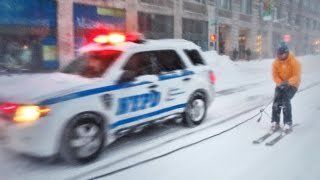 Al ritmo de Frank Sinatra estos "deportistas" intentaron esquiar por las calles congeladas de la Gran Manzana.
