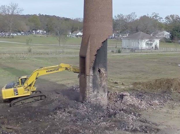 Un dron grabó el momento en el que un hombre derribó una enorme estructura de 48 metros de altura y 115 años de antigüedad usando una excavadora.La vieja chimenea de ladrillo había sufrido un intento de demolición con explosivos, pero su fortaleza no cedió.
