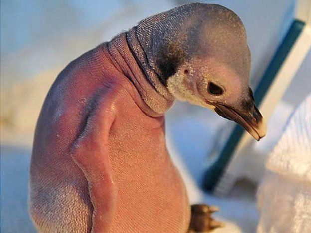 Pubricito el pingüinito: un bebé de estos animalitos nació sin plumas y fue abandonado por sus padres