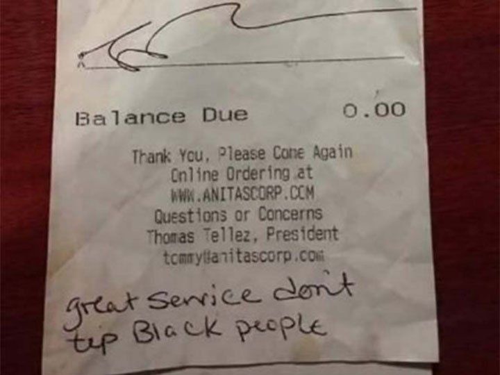 Kelly Carter, mesera del restaurante "Anita´s News Mexico Style Café", de Estados Unidos, se llevó una desagradable sorpresa cuando uno de sus clientes no le dio propina por ser afroamericana.