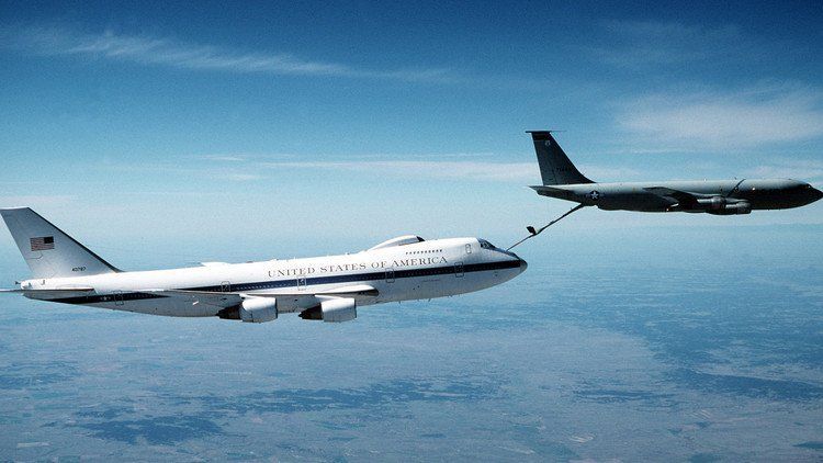 Donde sea que esté en el mundo el Air Force One, avión de la Fuerza Aérea de Estados Unidos que transporta al presidente de los Estados Unidos, un Boeing E-4B, conocido como el 'avión del juicio final' ('doomsday', en inglés), lo sigue de cerca. Se trata de un Boeing 747 especialmente modificado que escolta al presidente de EE.UU., sobre todo cuando viaja al extranjero. En la flota aérea de Estados Unidos hay cuatro aeronaves de este tipo.Los E-4B están equipados como centros de mando completos para el presidente y altos funcionarios, incluyendo al secretario de Defensa y a los jefes del Estado Mayor Conjunto en caso de una guerra nuclear o una emergencia nacional. Estas aeronaves tienen características únicas que no pueden ser comparadas con las ningún otro avión que utilice la Fuerza Aérea estadounidense.Los 'aviones del juicio final' han estado en servicio durante la Guerra Fría desde la década de 1970, como una de las mejores maneras de mantener al presidente a salvo de un posible ataque nuclear. Cuando están en vuelo, las aeronaves, también conocidas como Puesto de Mando Aerotransportado Avanzado, tienen un equipamiento especial y la capacidad de comunicarse con cualquier persona desde cualquier parte del mundo. Su diseño le permite sobrevivir a un fuerte pulso electromagnético con todos los sistemas intactos. El E-4B, que cuenta con tres cabinas, es capaz de operar con una tripulación más grande que cualquier aeronave de la historia de la Fuerza Aérea de Estados Unidos: 112 personas. Además, dispone de una antena que mantiene al presidente comunicado con la flota de submarinos nucleares, incluso si las comunicaciones terrestres son destruidas.Estos aviones también son capaces de hacer reabastecimiento en vuelo y de permanecer en el aire y en funcionamiento hasta más de 35 horas, aunque han sido diseñados para operar en vuelo durante una semana completa.Los E-4B se encuentran apostados cerca de Omaha, Nebraska, en la base aérea de Offutt. Uno de los aviones se mantiene en marcha en todo momento, con el motor funcionando las 24 horas del día en la base, cuando el presidente se encuentra en territorio nacional. Si ocurre una emergencia, el avión está listo para servir casi inmediatamente al mandatario.