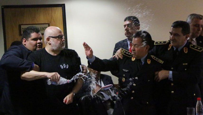 Cubas continuó mojando a otros asistentes, entre ellos el ministro del Interior, Juan Ernesto Villamayor, que apenas reaccionó, y sin que las fuerzas de seguridad a cargo del control en la sala de debate intervinieran.