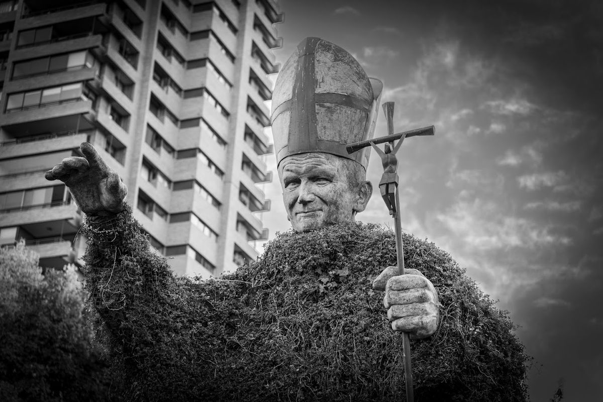 Aquí se encuentra la enorme estatua de Juan Pablo II cubierta de un manto natural verde