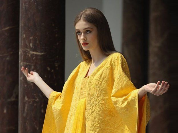 La modelo Bianca Gavrilas viste la capa tejida a mano con seda dorada de araña, en la galería Medieval y del Renacimiento del museo londinense V&A, el 23 de enero del 2012. La capa es uno de los dos únicos textiles elaborados con seda dorada de araña en el mundo.