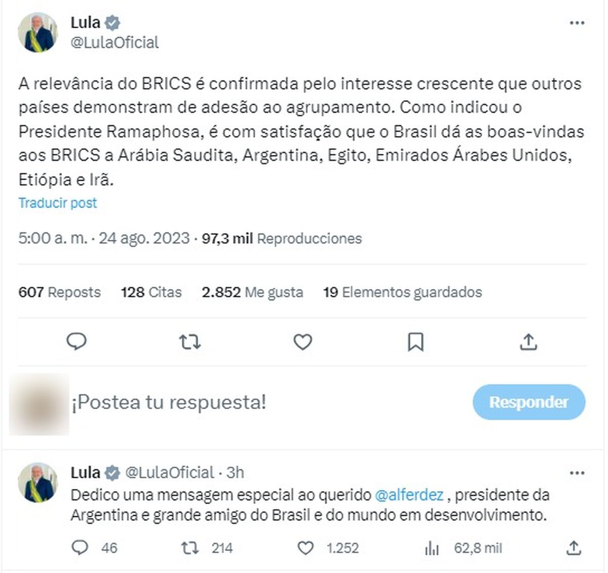 Por su parte, el presidente de Brasil, Luiz Inácio Lula da Silva, uno de los grandes impulsores de la incorporación de Argentina al bloque, publicó en su cuenta de Twitter: "La relevancia de los BRICS se ve confirmada por el creciente interés mostrado por otros países en unirse al grupo. Como indicó el Presidente Ramaphosa, Brasil recibe con satisfacción a los BRICS: Arabia Saudita, Argentina, Egipto, Emiratos Árabes Unidos, Etiopía e Irán".