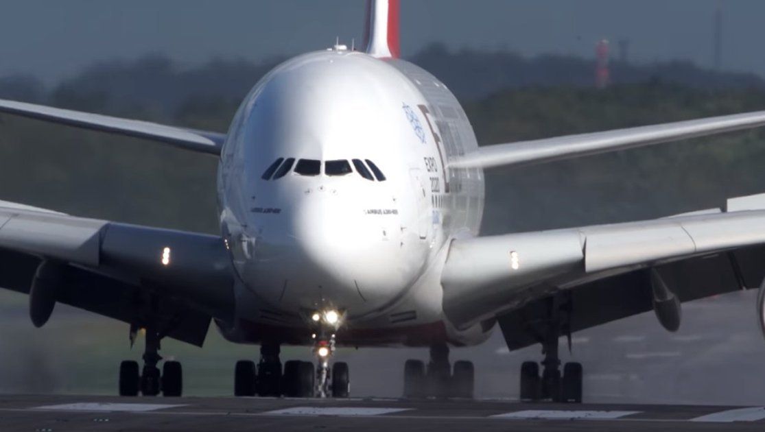Un Airbus A380 de la aerolínea Emirates, el mayor avión de pasajeros del mundo, fue filmado mientras intentaba aterrizar en el aeropuerto internacional de Dusseldorf este jueves.
