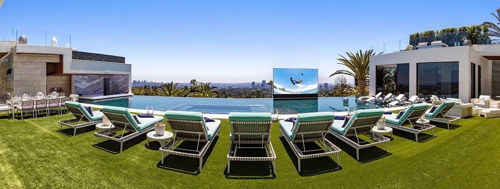 Este palacio posmoderno está situado en el lujoso barrio de Bel-Air, en el área metropolitana del gran Los Ángeles. Y mientras que la intimidad de los habitantes de la lujosa residencia es clave, incluido un foso cristalino que separa la mansión del resto del mundo, desde allí se ve todo, una vista que va desde los rascacielos del centro de la ciudad californiana a las costas de Malibú pasando por las colinas donde se alza el Museo Getty.