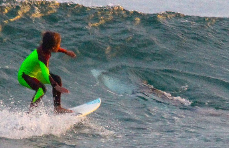 Un surfero de 10 años se encontró de cerca con un tiburón que se coló en su foto mientras compartían una ola en una playa de Australia.