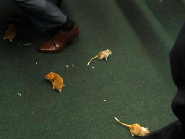 Los ratones, de color marrón claro, caminaban sobre la alfombra verde del salón repleto ante un Vaccari impávido, constató un periodista de la agencia de noticias AFP.Entre los gritos de los diputados pidiendo agentes de seguridad y para reclamar que el evento no se transformara "en un circo", una persona fue retirada del recinto por la fuerza.