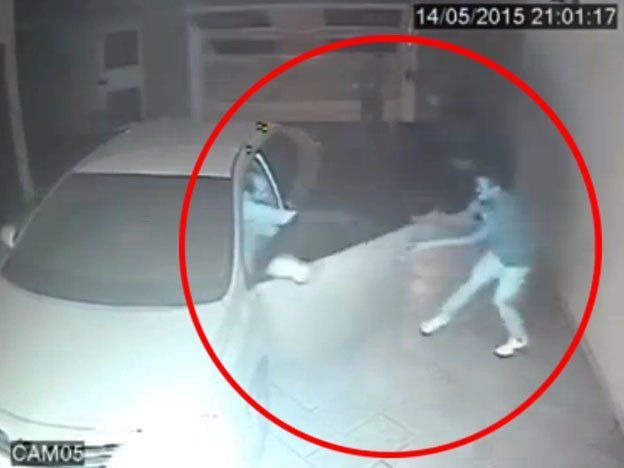 Un impactante video de un intento de asalto fue captado por una cámara de seguridad en Brasil.En las imágenes se puede observar como tres delincuentes abordan a un hombre que estaba guardando su auto adentro de la cochera de su casa.