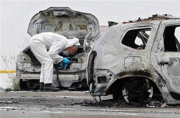 Expertos forenses examinaban los restos calcinados de los tres autos y el camión blindado, operado por la compañía de seguridad Lumis.