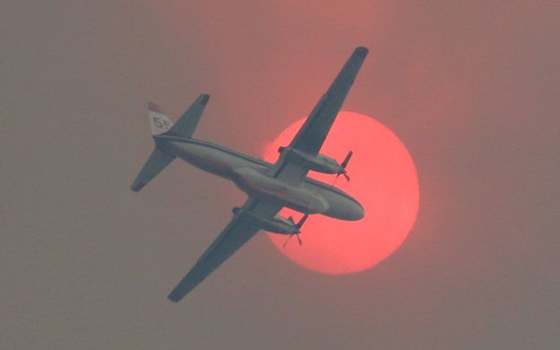 La foto del día. Lucha aérea. Un avión ignífugo pasa por delante del sol mientras trabaja en tratar de sofocar un incendio en la localidad de Twisp, Washington.