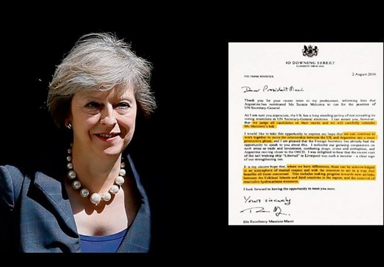 A través de una carta, la primera ministra de Reino Unido, Theresa May, expresó la necesidad de negociar acerca de las "conexiones aéreas entre las Islas Malvinas y terceros países en la región", tal como la conexión que existió hasta la guerra de 1982, y la remoción de "medidas restrictivas para la producción de hidrocarburos" en la zona.