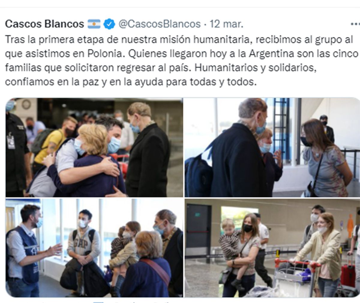 Además de esta acción en solidaridad con el pueblo ucraniano, Cascos Blancos realiza distintas acciones para ayudar a los argentinos que quedaron varados en medio del conflicto bélico.