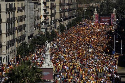 Cientos de miles de personas llenaron Barcelona de banderas españolas, catalanas y europeas en una manifestación contra la independencia de Cataluña, en el último episodio de la peor crisis política en España en 40 años. Entre 350 mil personas, según la policía catalana, y casi un millón según los organizadores, se ha visto un acto masivo en el que los catalanes han dicho "no" sonoramente al radicalizado movimiento separatista, a horas de que el gobierno regional concrete su promesa de independencia.