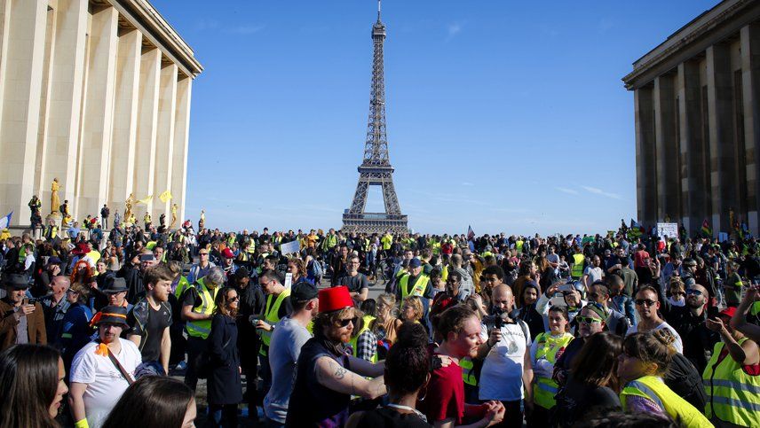Bajo el sol primaveral, en la capital la columna de manifestantes llegó a media tarde a la plaza del Trocadero, frente a la torre Eiffel.