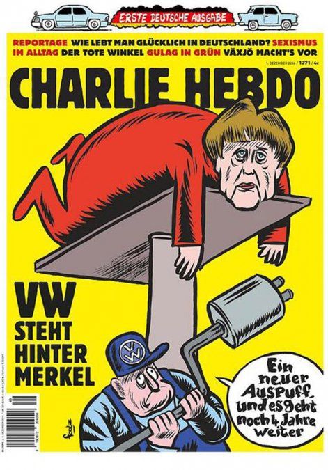 Es una imagen más bien benévola, comparada con las más provocadoras portadas que caracterizan a la edición francesa, mientras que a Petry, líder de la xenófoba Alternativa para Alemania (AfD), se la caricaturiza como un Hitler femenino. La tirada de arranque de la edición alemana se sitúa en los 200.000 ejemplares y las páginas interiores se nutren de dibujos adoptados del original francés, con el texto traducido al alemán.
