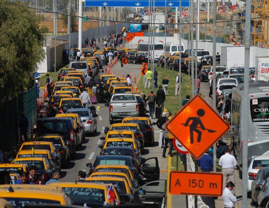 Varios taxis fueron cruzados en la carretera de acceso a la terminal chilena, bloqueando por varias horas la entrada y salida al aeropuerto, lo que obligó a muchos pasajeros a bajarse de los automóviles y caminar largos trayectos juntos con sus maletas.