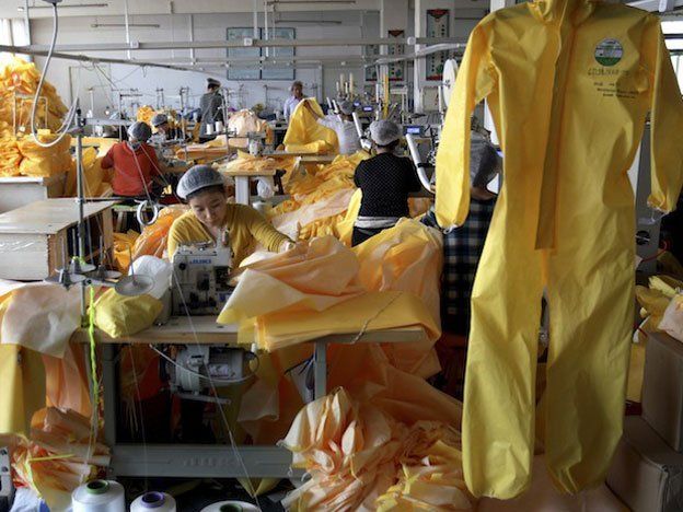 Lejos de la zona caliente del brote de ébola, las máquinas de coser y pegar de una fábrica en China han estado trabajando más de lo normal para producir los trajes amarillos que protegen a los médicos que combaten la enfermedad en primera línea a más de 11.000 kilómetros de distancia en África occidental.