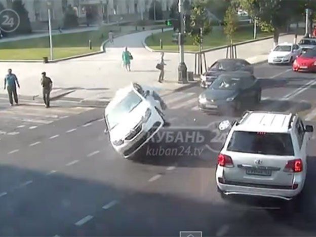 En la ciudad de Krasnodar (sur de Rusia), en una intersección tuvo lugar un accidente de tráfico del que afortunadamente nadie salió herido.Ocurrió el 3 de agosto, pero lo curioso es cuando a causa de la colisión un vehículo sale disparado hacia atrás sobre las ruedas derechas, los dos peatones que ven como el vehículo se les viene encima casi ni si inmutan, y uno de ellos incluso sigue hablando por el móvil mientras apenas se hace a un lado para evitar ser arrollado.