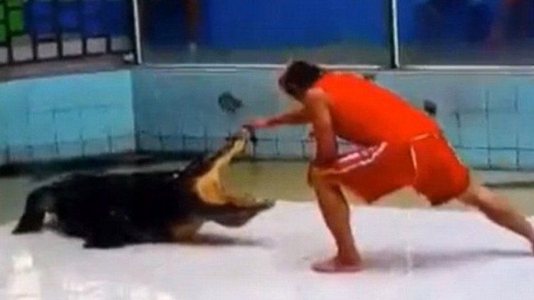 En las Red ha aparecido un terrorífico video grabado durante un espectáculo que tuvo lugar en Phuket (Tailanda), en que se puede ver a un cocodrilo a punto de arrancarle el brazo a su entrenador, informan medios locales.