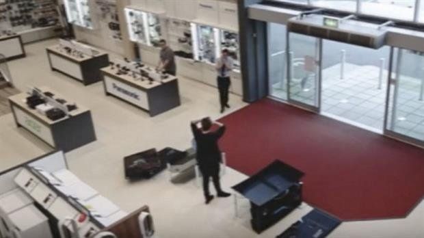 El momento quedó registrado por una cámara de seguridad que muestra la secuencia. Luego de la caída de los televisores, el cliente y un vendedor se agarraron la cabeza con las manos.