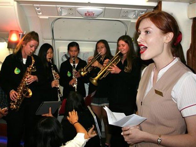 Para ello pudieron convencer a los músicos de la Baradene College Concert Band, que casualmente viajaban en el mismo vuelo, de que tocaran para ellos.