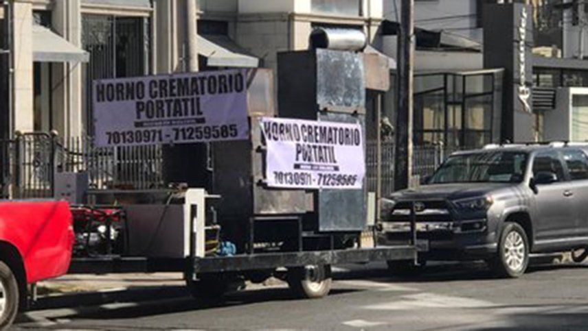 En medio de un panorama desolador se puede ver un letrero que llama la atención: "Hornos crematorios móviles". Está colgado sobre un gran aparato y es transportado por un camión por distintas calles de La Paz.