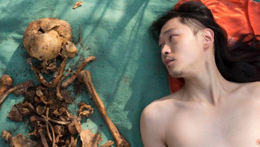 El artista de 33 años, conocido como Siyuan Zhuji, exhumó los restos de su padre y los colocó en un esqueleto antes de acostarse desnudo junto a ellos para una sesión de fotos.