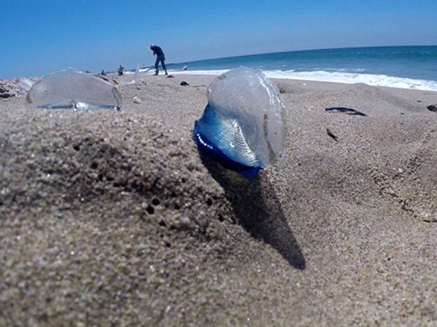 También conocidas como velero las criaturas tienen una aleta clara distintiva pegada en su cuerpo oval azul no tan largo como una palma de la mano.